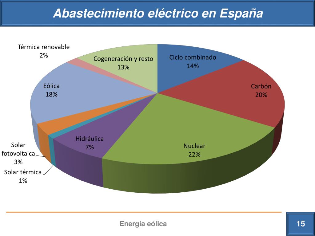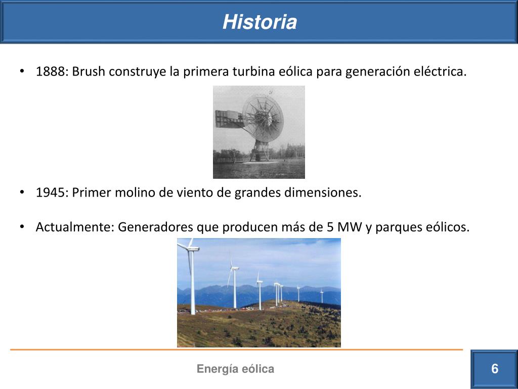Historia • 1888: Brush construye la primera turbina eólica para generación eléctrica. • 1945: Primer molino de viento de grandes dimensiones. • Actualmente: Generadores que producen más de 5 MW y parques eólicos. Energía eólica