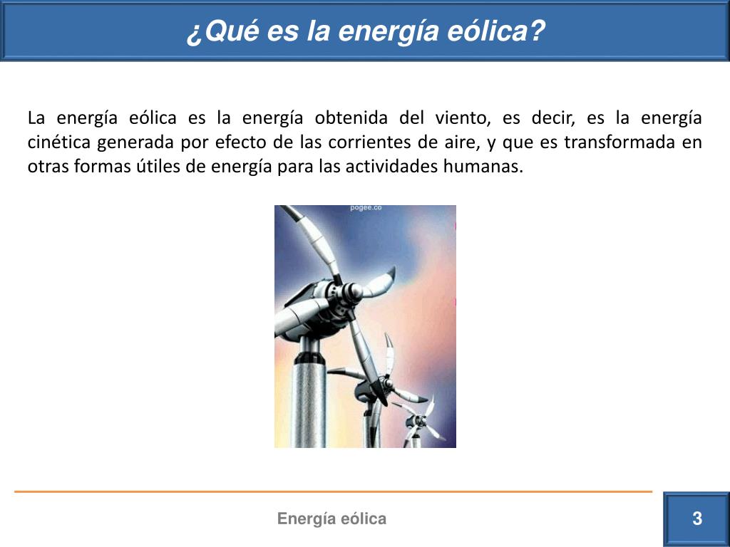 ¿Qué es la energía eólica? La energía eólica es la energía obtenida del viento, es decir, es la energía cinética generada por efecto de las corrientes de aire, y que es transformada en otras formas útiles de energía para las actividades humanas. Energía eólica