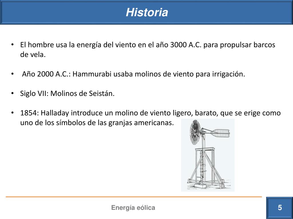 Historia • El hombre usa la energía del viento en el año 3000 A.C. para propulsar barcos de vela. • Año 2000 A.C.: Hammurabi usaba molinos de viento para irrigación. • Siglo VII: Molinos de Seistán. • 1854: Halladay introduce un molino de viento ligero, barato, que se erige como uno de los símbolos de las granjas americanas. Energía eólica