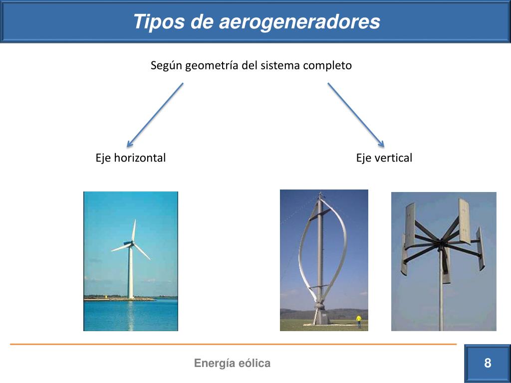 Tipos de aerogeneradores • Según geometría del sistema completo Eje horizontal Eje vertical Energía eólica