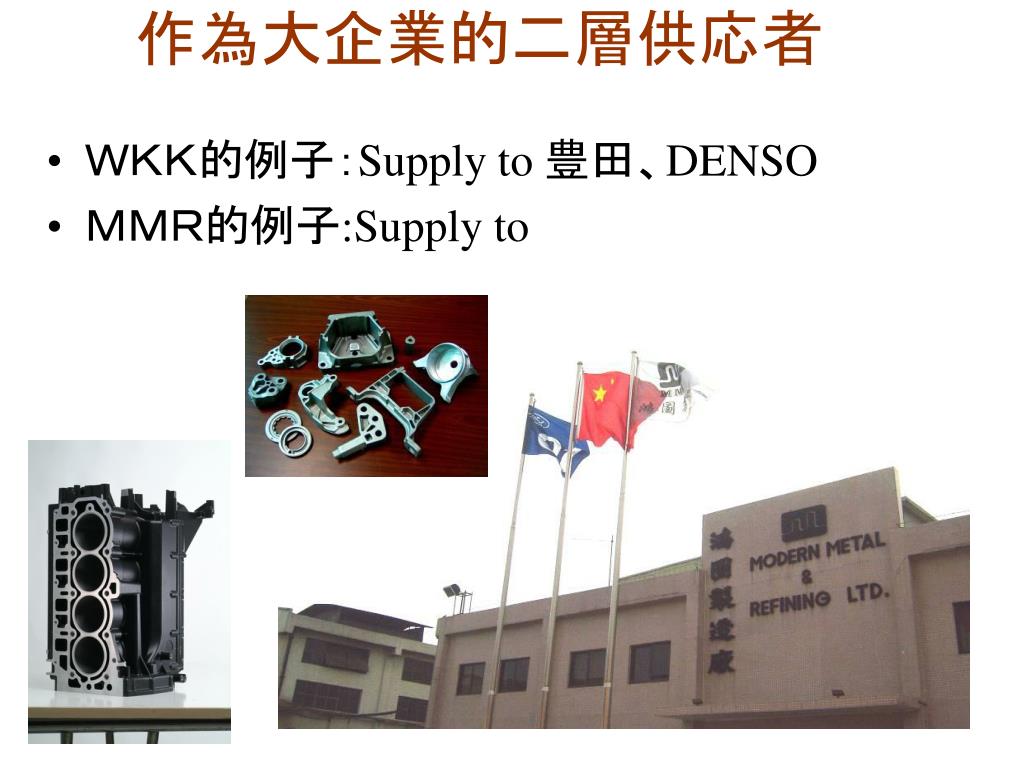 作為大企業的二層供応者 • WKK的例子:Supply to 豊田、DENSO • MMR的例子:Supply to
