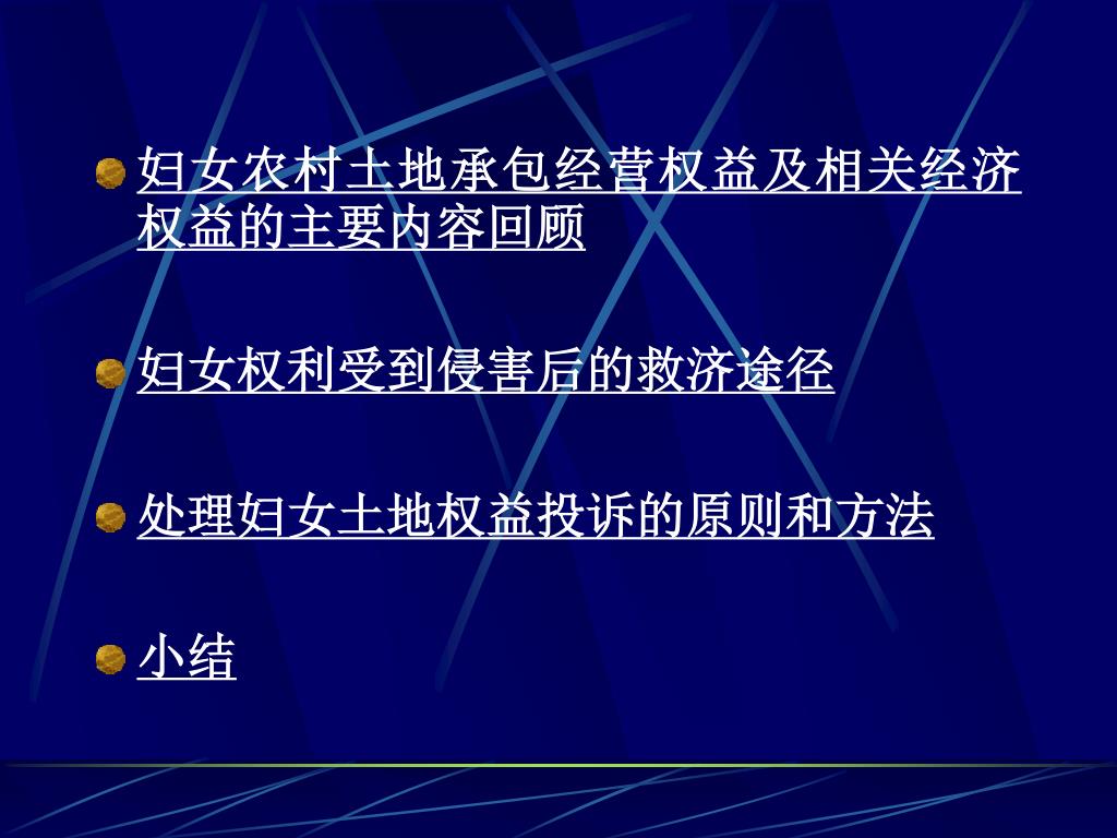 一、 为什么关注土地承包问题 • 二、 介绍两部法律 • 三、 妇女土地权益受到怎样的侵犯 • 四、 为什么特别关注妇女