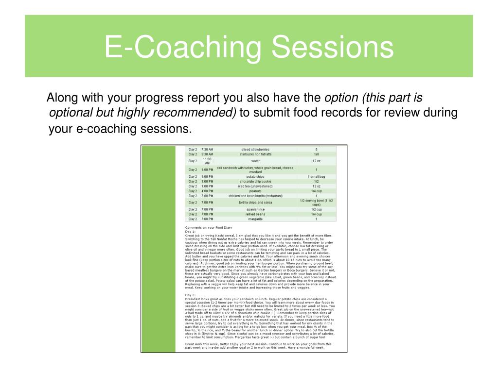 E-Coaching Sessions Along with your progress report you also have the option (this part is optional but highly recommended) to submit food records for review during your e-coaching sessions.