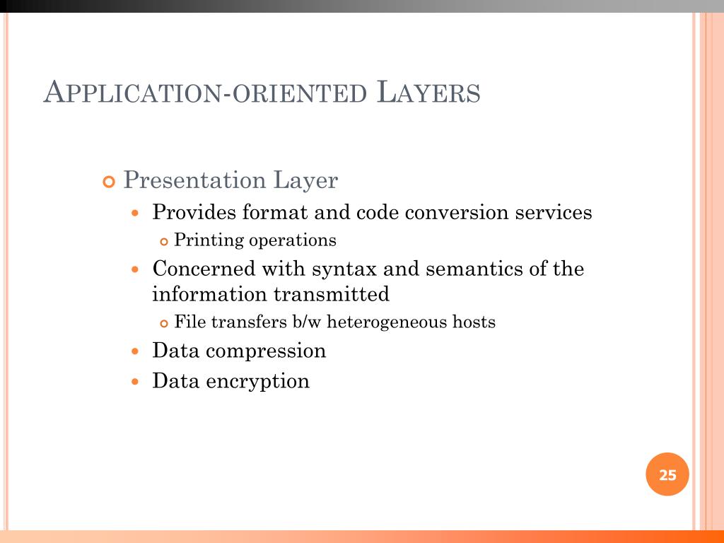 Application-oriented Layers • Presentation Layer • Provides format and code conversion services • Printing operations • Concerned with syntax and semantics of the information transmitted • File transfers b/w heterogeneous hosts • Data compression • Data encryption