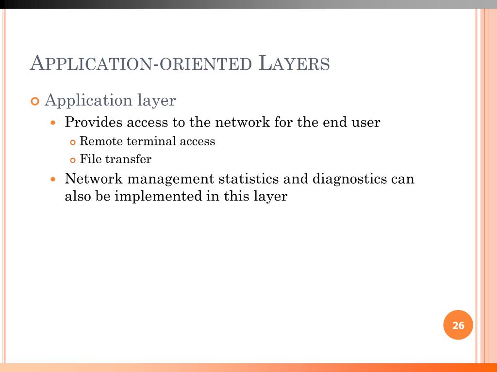 Application-oriented Layers • Application layer • Provides access to the network for the end user • Remote terminal access • File transfer • Network management statistics and diagnostics can also be implemented in this layer