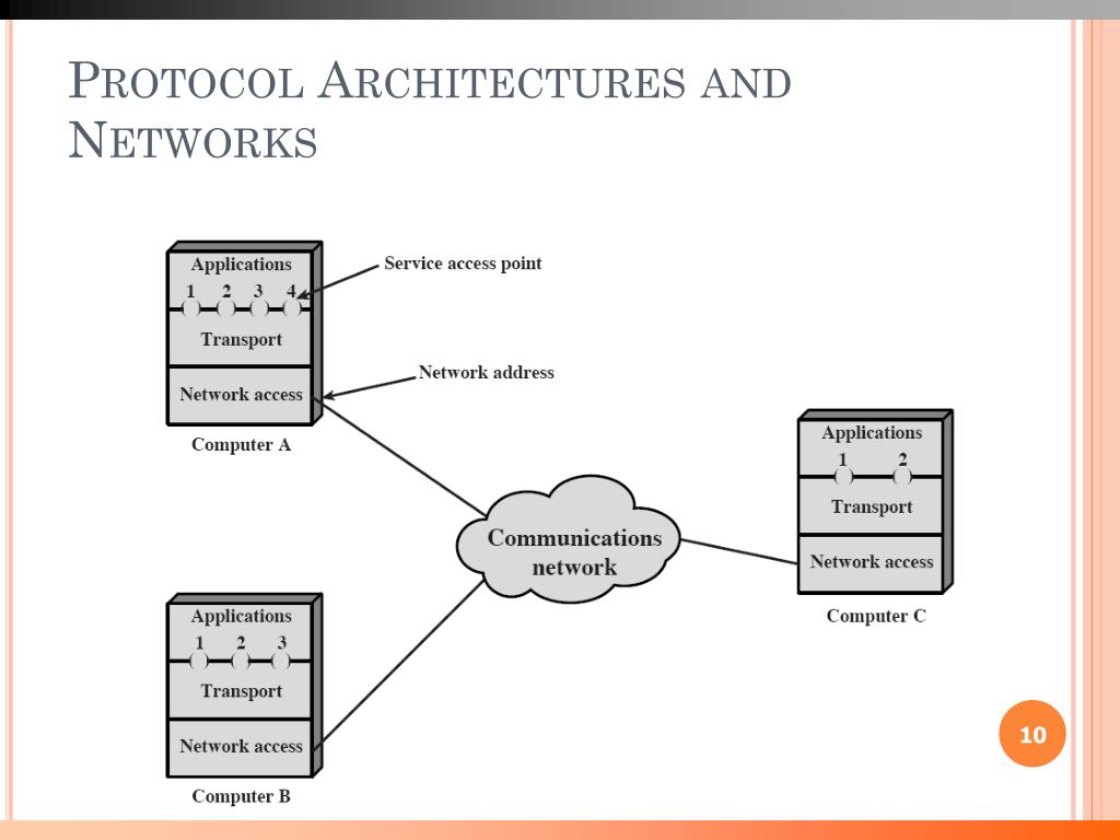 Example: Three-Layer Model • Addressing Requirements • Two levels of addressing required • Each computer needs unique network address • Each application on a multi-tasking computer needs a unique address within the computer • Service Access Point (SAP)