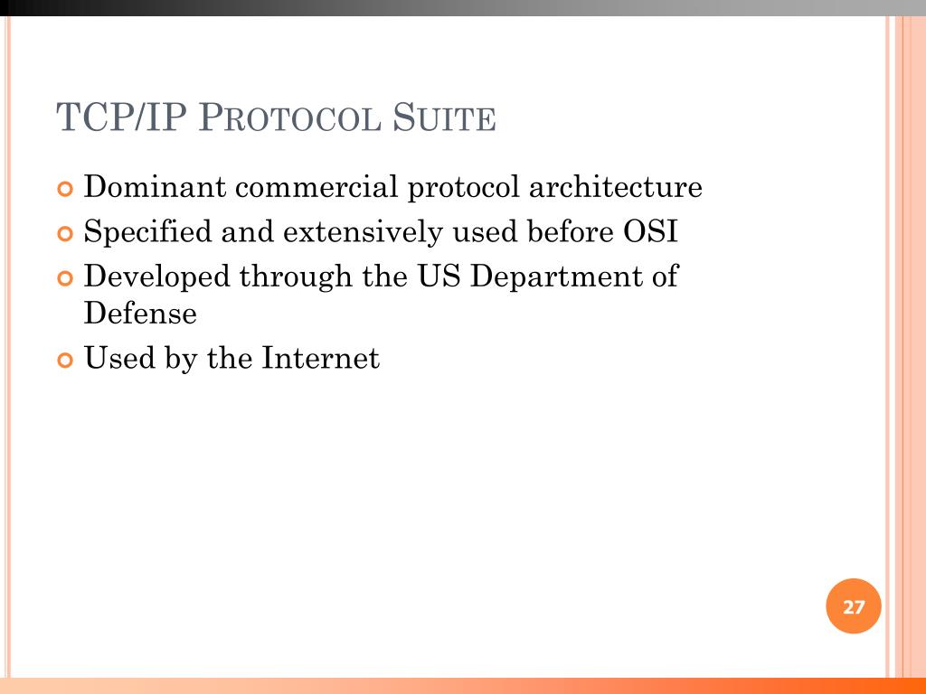 TCP/IP Protocol Suite • Dominant commercial protocol architecture • Specified and extensively used before OSI • Developed through the US Department of Defense • Used by the Internet