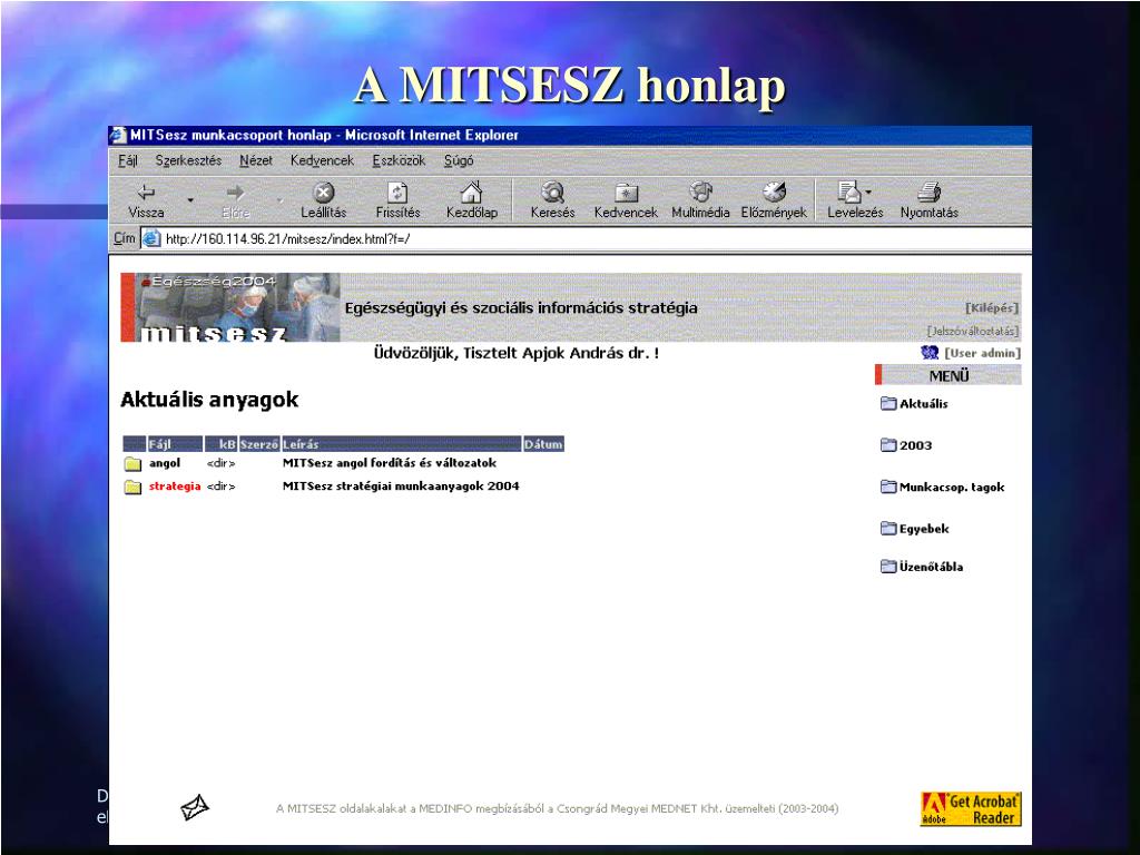 eEgészség programok MAGYAR INFORMÁCIÓS TÁRSADALOM STRATÉGIAEgészségügyi és szociális ágazat MITSESZ 2004. Apjok András