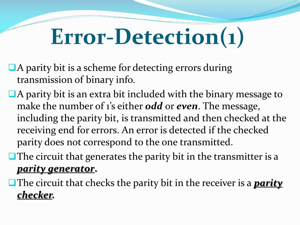 Error-Detection(1) • A parity bit is a scheme for detecting errors during transmission of binary info. • A parity bit is an extra bit included with the binary message to make the number of 1’s either oddor even. The message, including the parity bit, is transmitted and then checked at the receiving end for errors. An error is detected if the checked parity does not correspond to the one transmitted. • The circuit that generates the parity bit in the transmitter is a parity generator. • The circuit that checks the parity bit in the receiver is a parity checker.