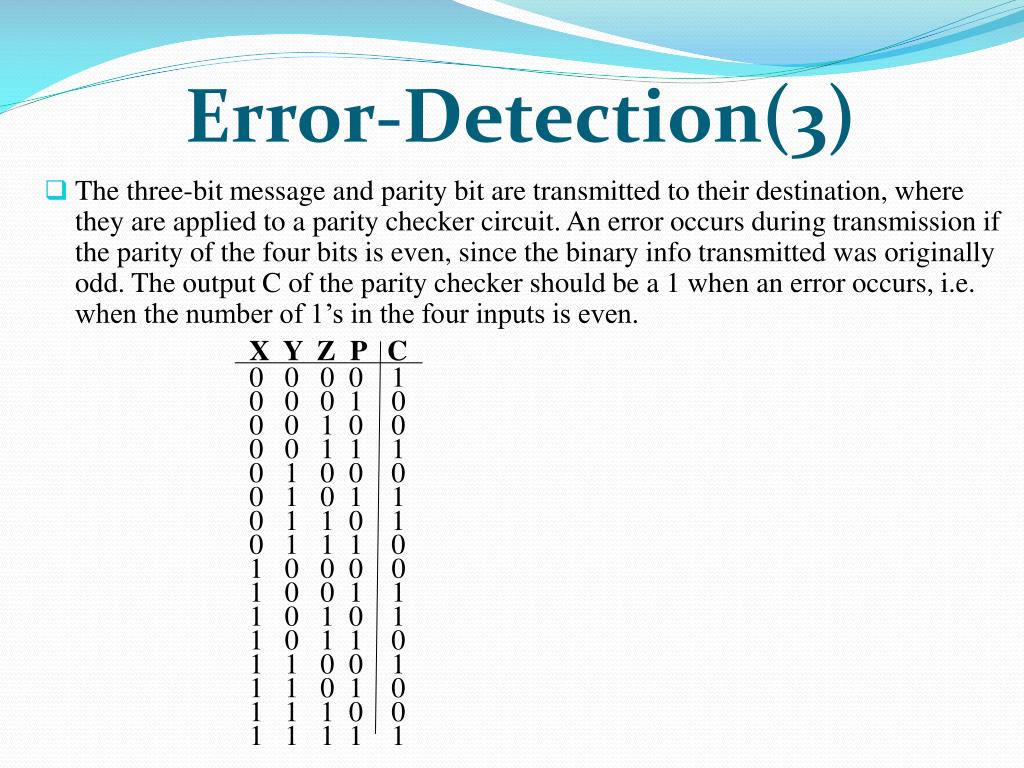Error-Detection(2) Parity generator truth table * For odd parity, the bit P is generated so as to make the number of 1’s odd (including P) X Y Z P 0 0 0 1 0 0 1 0 0 1 0 0 0 1 1 1 1 0 0 0 1 0 1 1 1 1 0 1 1 1 1 0