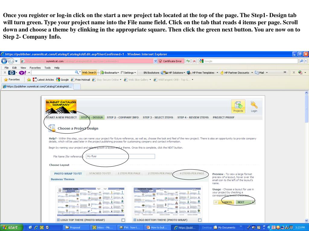 Once you register or log-in click on the start a new project tab located at the top of the page. The Step1- Design tab will turn green. Type your project name into the File name field. Click on the tab that reads 4 items per page. Scroll down and choose a theme by clinking in the appropriate square. Then click the green next button. You are now on to Step 2- Company Info.