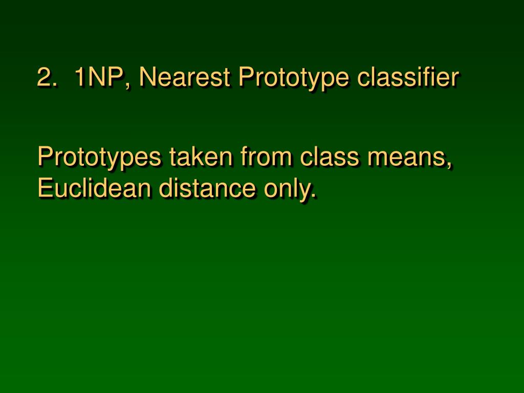 2. 1NP, Nearest Prototype classifier Prototypes taken from class means, Euclidean distance only.