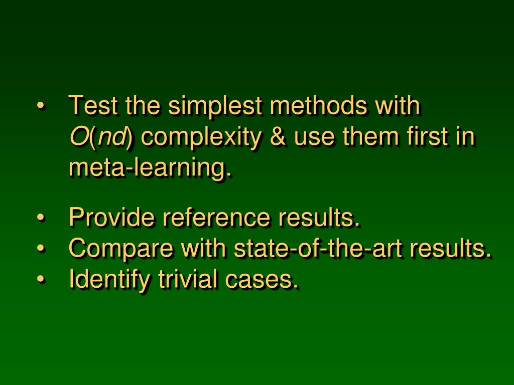 Test the simplest methods with O(nd) complexity & use them first in meta-learning. • Provide reference results. • Compare with state-of-the-art results. • Identify trivial cases.