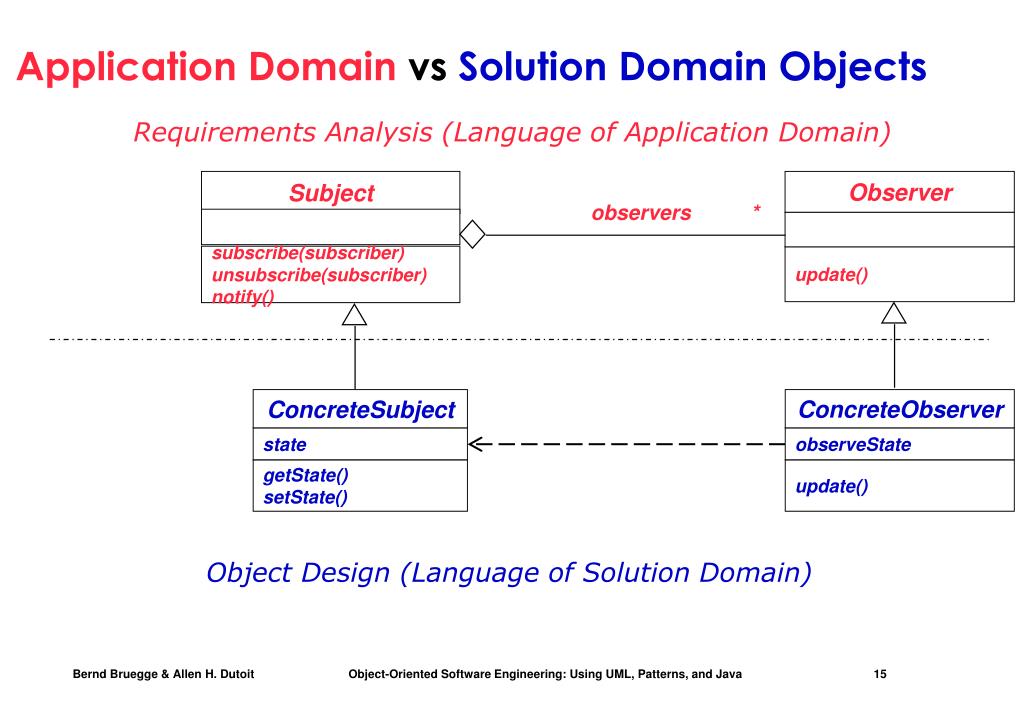 Observer observers * ConcreteSubject ConcreteObserver state observeState getState() setState() update() Object Design (Language of Solution Domain) Application Domain vs Solution Domain Objects Requirements Analysis (Language of Application Domain) Subject subscribe(subscriber) unsubscribe(subscriber) notify() update()