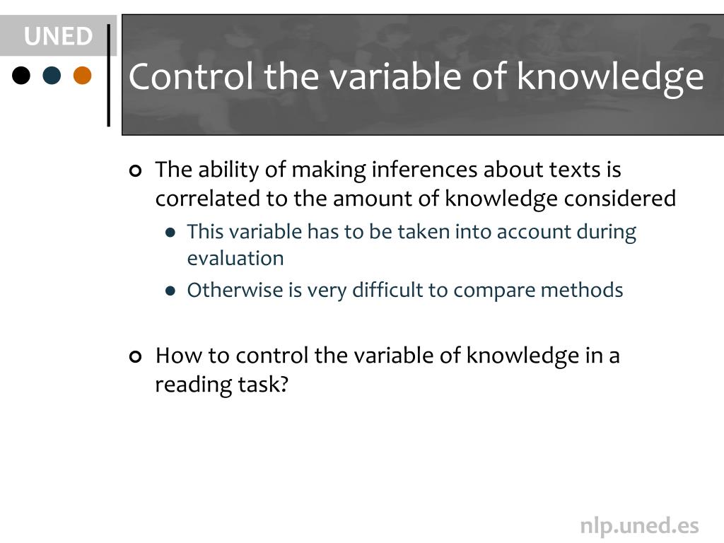Control the variable of knowledge • The ability of making inferences about texts is correlated to the amount of knowledge considered • This variable has to be taken into account during evaluation • Otherwise is very difficult to compare methods • How to control the variable of knowledge in a reading task?