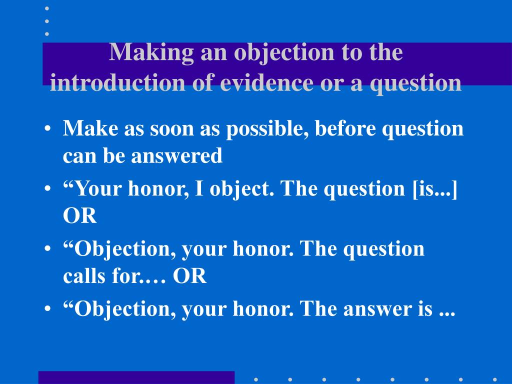 Making an objection to the introduction of evidence or a question • Make as soon as possible, before question can be answered • “Your honor, I object. The question [is...] OR • “Objection, your honor. The question calls for.… OR • “Objection, your honor. The answer is ...