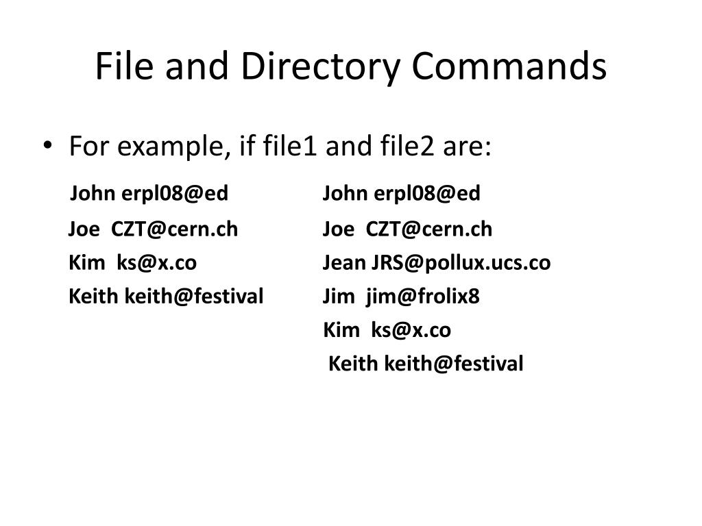 File and Directory Commands • For example, if file1 and file2 are: John erpl08@ed John erpl08@ed Joe CZT@cern.ch Joe CZT@cern.ch Kim ks@x.co Jean JRS@pollux.ucs.co Keith keith@festival Jim jim@frolix8 Kim ks@x.co Keith keith@festival