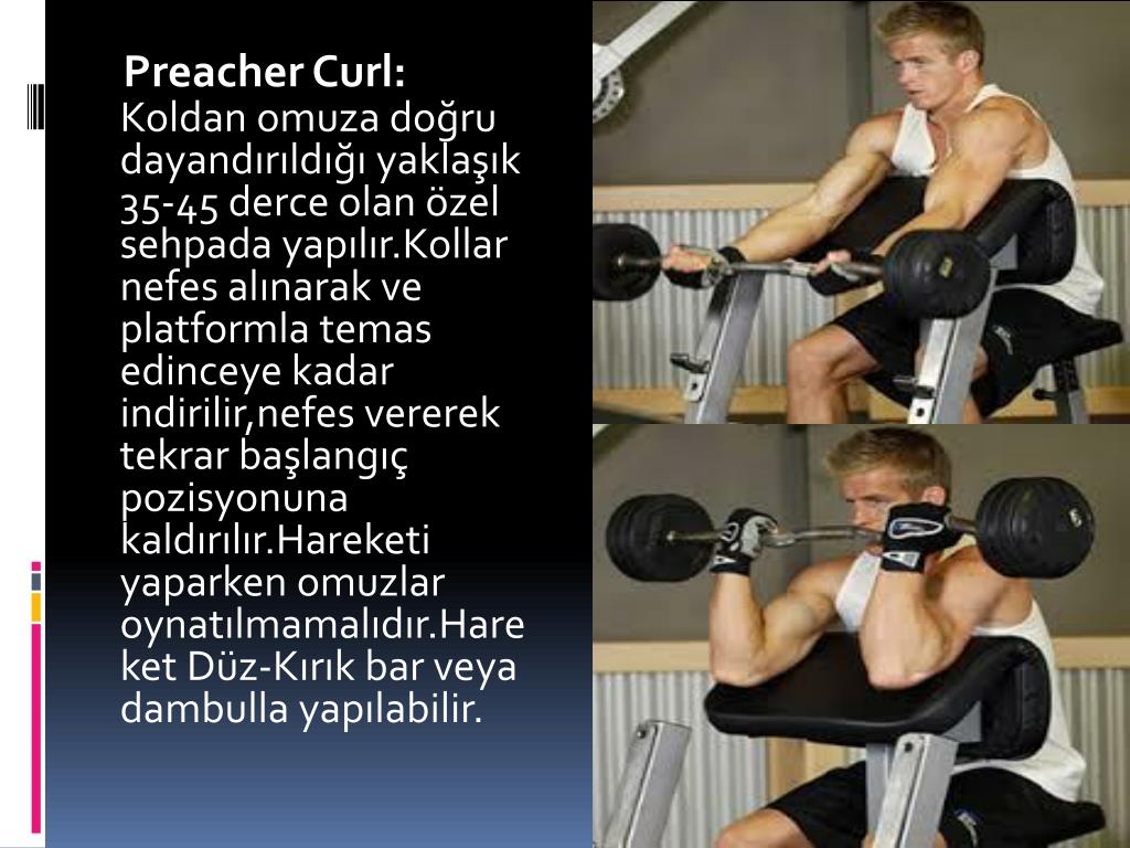 PreacherCurl: Koldan omuza doğru dayandırıldığı yaklaşık 35-45 derce olan özel sehpada yapılır.Kollar nefes alınarak ve platformla temas edinceye kadar indirilir,nefes vererek tekrar başlangıç pozisyonuna kaldırılır.Hareketi yaparken omuzlar oynatılmamalıdır.Hareket Düz-Kırık bar veya dambulla yapılabilir.