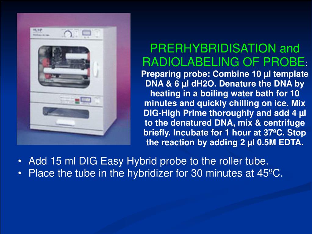 PRERHYBRIDISATION and RADIOLABELING OF PROBE:Preparing probe: Combine 10 µl template DNA & 6 µl dH2O. Denature the DNA by heating in a boiling water bath for 10 minutes and quickly chilling on ice. Mix DIG-High Prime thoroughly and add 4 µl to the denatured DNA, mix & centrifuge briefly. Incubate for 1 hour at 37ºC. Stop the reaction by adding 2 µl 0.5M EDTA. Add 15 ml DIG Easy Hybrid probe to the roller tube. Place the tube in the hybridizer for 30 minutes at 45ºC.