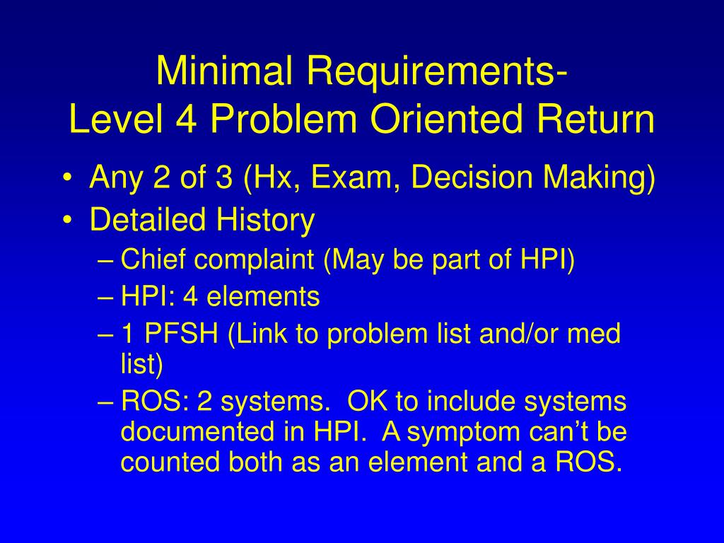 Minimal Requirements-Level 4 Problem Oriented Return • Any 2 of 3 (Hx, Exam, Decision Making) • Detailed History • Chief complaint (May be part of HPI) • HPI: 4 elements • 1 PFSH (Link to problem list and/or med list) • ROS: 2 systems. OK to include systems documented in HPI. A symptom can’t be counted both as an element and a ROS.