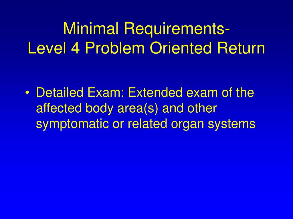 Minimal Requirements-Level 4 Problem Oriented Return • Detailed Exam: Extended exam of the affected body area(s) and other symptomatic or related organ systems