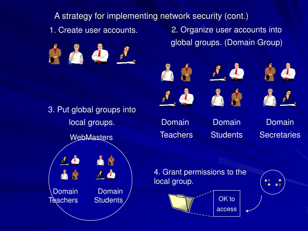 Domain Teachers Domain Students Domain Secretaries Domain Students Domain Teachers A strategy for implementing network security (cont.) 2. Organize user accounts into global groups. (Domain Group) 1. Create user accounts. 3. Put global groups into local groups. WebMasters Local Groups Give Access To Resources