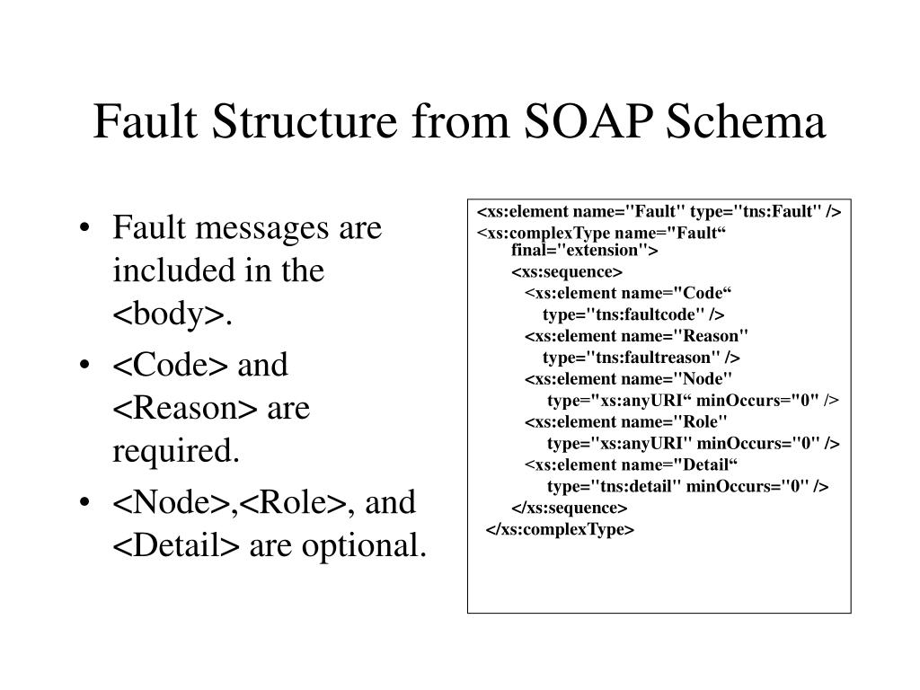 A fault detail is just an extension element. Carries application specific information It can contain any number of elements of any type. This is intended for the SOAP implementer to put in specific information. You can define your own SOAP fault detail schemas specific to your application. Axis, for example, includes Java exception stack traces. <xs:complexType name="detail"> <xs:sequence> <xs:any namespace="##any" processContents="lax" minOccurs="0" maxOccurs="unbounded" /> </xs:sequence> <xs:anyAttribute namespace="##other" processContents="lax" /> </xs:complexType> Fault Detail
