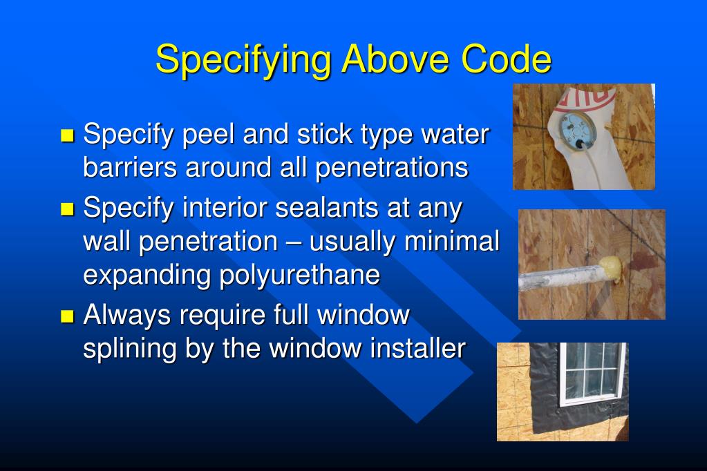 Specifying Above Code • Specify peel and stick type water barriers around all penetrations • Specify interior sealants at any wall penetration – usually minimal expanding polyurethane • Always require full window splining by the window installer