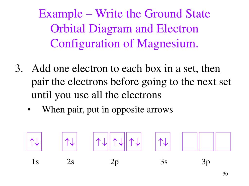 1s 2s 2p 3s 3p Example – Write the Ground State Orbital Diagram and Electron Configuration of Magnesium. • Draw 9 boxes to represent the first 3 energy levels sandp orbitals