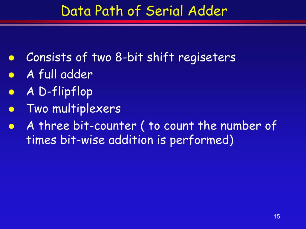 Data Path of Serial Adder • Consists of two 8-bit shift regiseters • A full adder • A D-flipflop • Two multiplexers • A three bit-counter ( to count the number of times bit-wise addition is performed)