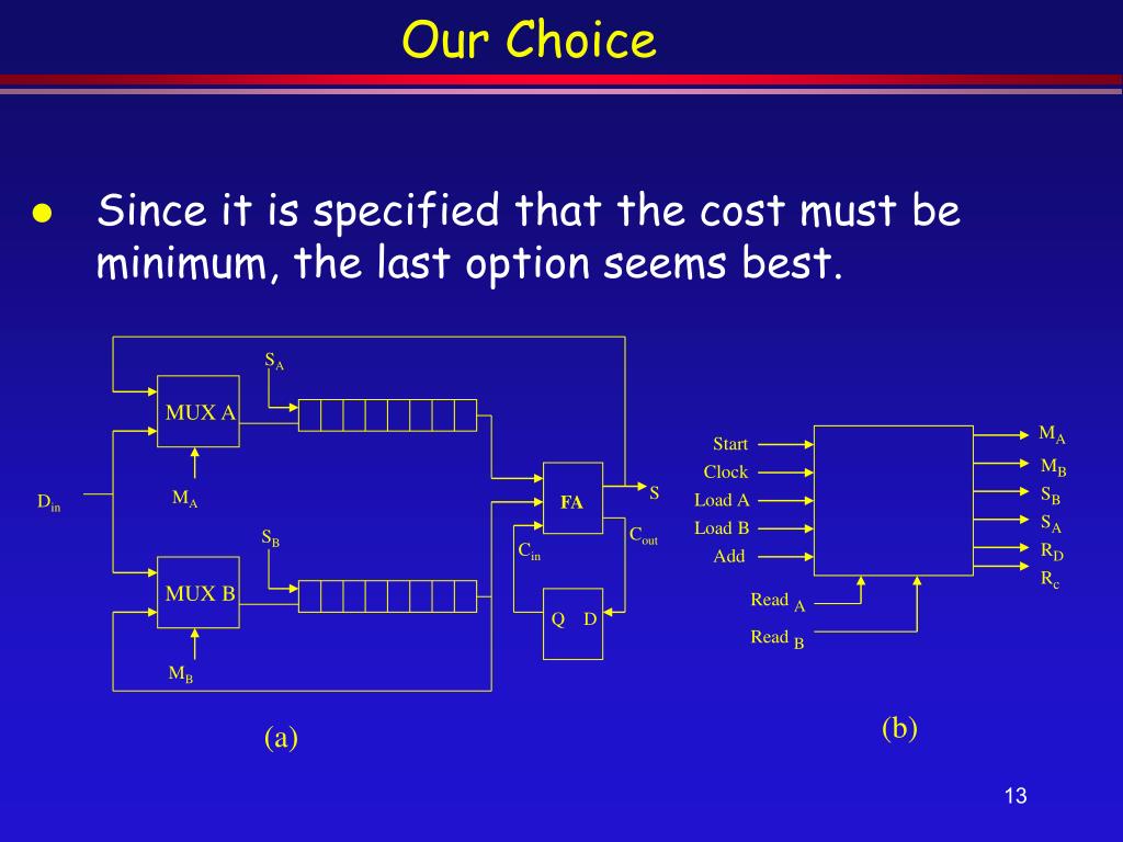 Our Choice SA MUX A MA Start MB Clock SB S MA Load A Din FA SA Load B Cout SB RD Cin Add Rc MUX B Read A Q D Read B MB (b) (a) • Since it is specified that the cost must be minimum, the last option seems best.