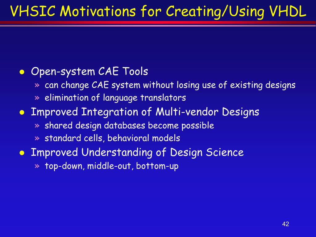VHSIC Motivations for Creating/Using VHDL • Open-system CAE Tools • can change CAE system without losing use of existing designs • elimination of language translators • Improved Integration of Multi-vendor Designs • shared design databases become possible • standard cells, behavioral models • Improved Understanding of Design Science • top-down, middle-out, bottom-up