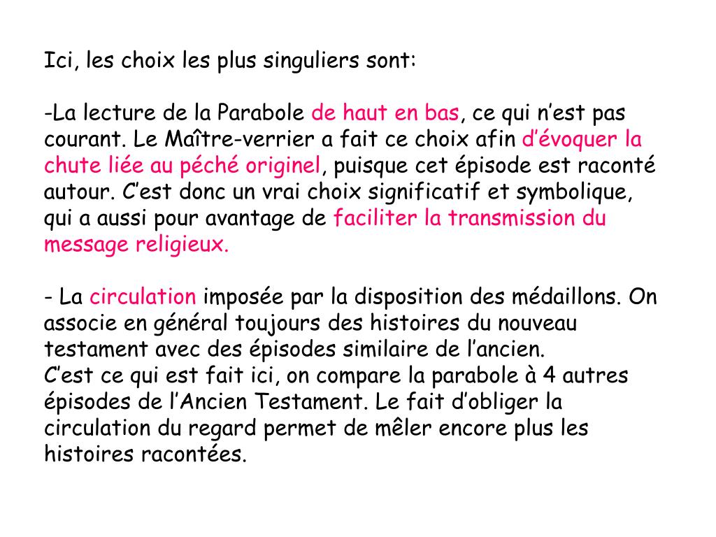 Ici, les choix les plus singuliers sont: • La lecture de la Parabole de haut en bas, ce qui n’est pas courant. Le Maître-verrier a fait ce choix afin d’évoquer la chute liée au péché originel, puisque cet épisode est raconté autour. C’est donc un vrai choix significatif et symbolique, qui a aussi pour avantage de faciliter la transmission du message religieux. • La circulation imposée par la disposition des médaillons. On associe en général toujours des histoires du nouveau testament avec des épisodes similaire de l’ancien. • C’est ce qui est fait ici, on compare la parabole à 4 autres épisodes de l’Ancien Testament. Le fait d’obliger la circulation du regard permet de mêler encore plus les histoires racontées.