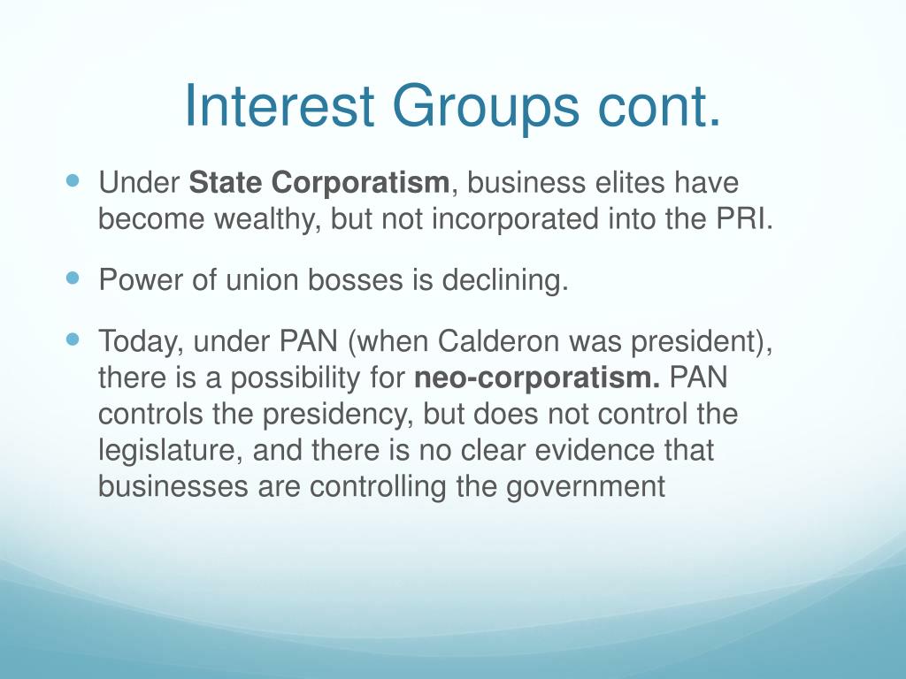 Interest Groups cont. • Under State Corporatism, business elites have become wealthy, but not incorporated into the PRI. • Power of union bosses is declining. • Today, under PAN (when Calderon was president), there is a possibility for neo-corporatism. PAN controls the presidency, but does not control the legislature, and there is no clear evidence that businesses are controlling the government