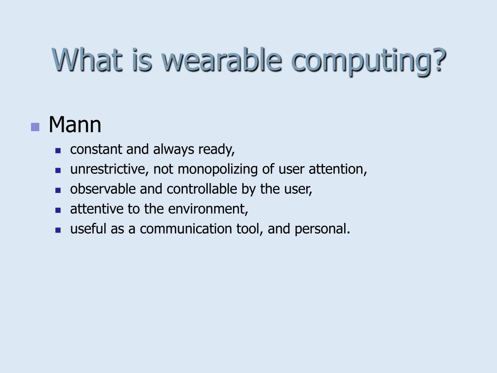 What is wearable computing? • Mann • constant and always ready, • unrestrictive, not monopolizing of user attention, • observable and controllable by the user, • attentive to the environment, • useful as a communication tool, and personal.