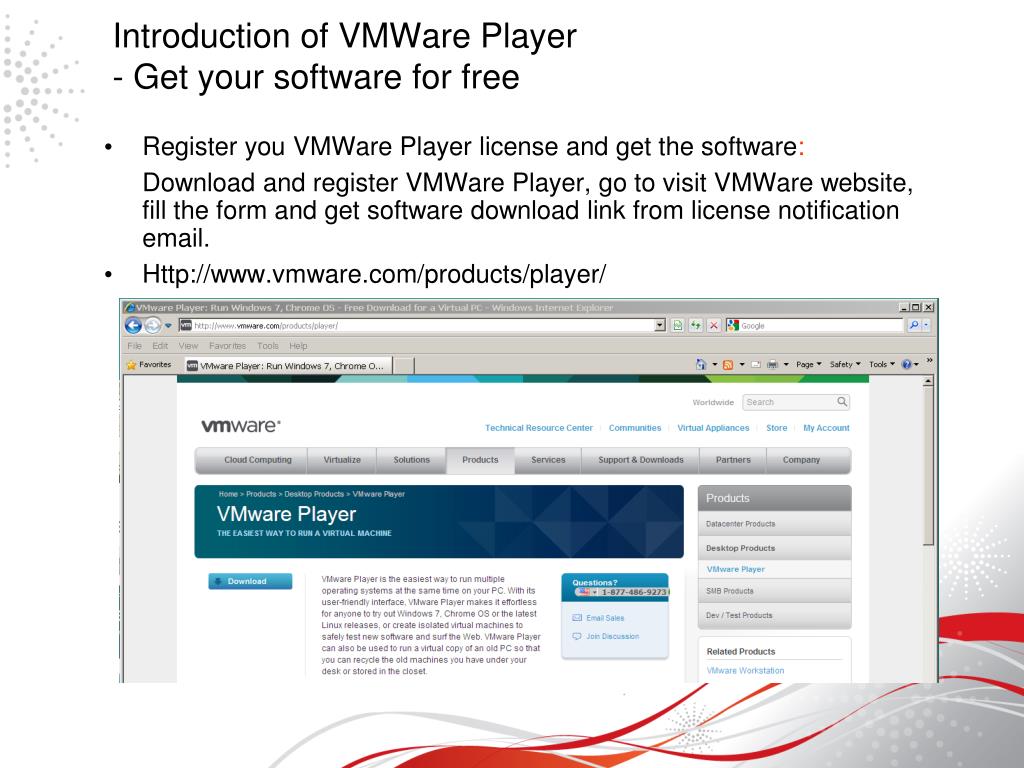 Introduction of VMWare Player - Get your software for free • Register you VMWare Player license and get the software: • Download and register VMWare Player, go to visit VMWare website, fill the form and get software download link from license notification email. • Http://www.vmware.com/products/player/