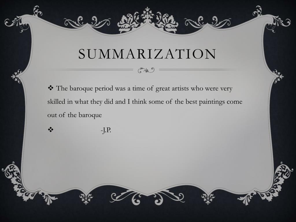 summarization • The baroque period was a time of great artists who were very skilled in what they did and I think some of the best paintings come out of the baroque • -J.P.