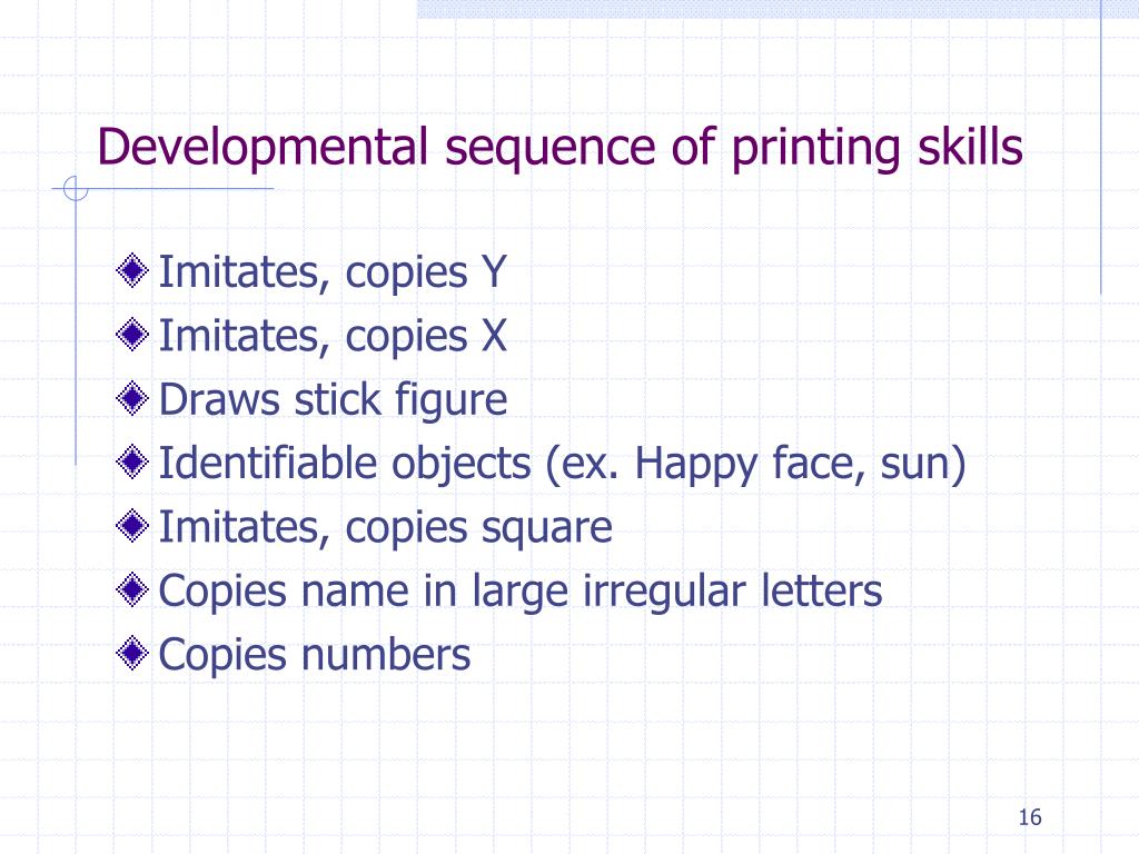 Developmental sequence of printing skills • Imitates, copies Y • Imitates, copies X • Draws stick figure • Identifiable objects (ex. Happy face, sun) • Imitates, copies square • Copies name in large irregular letters • Copies numbers