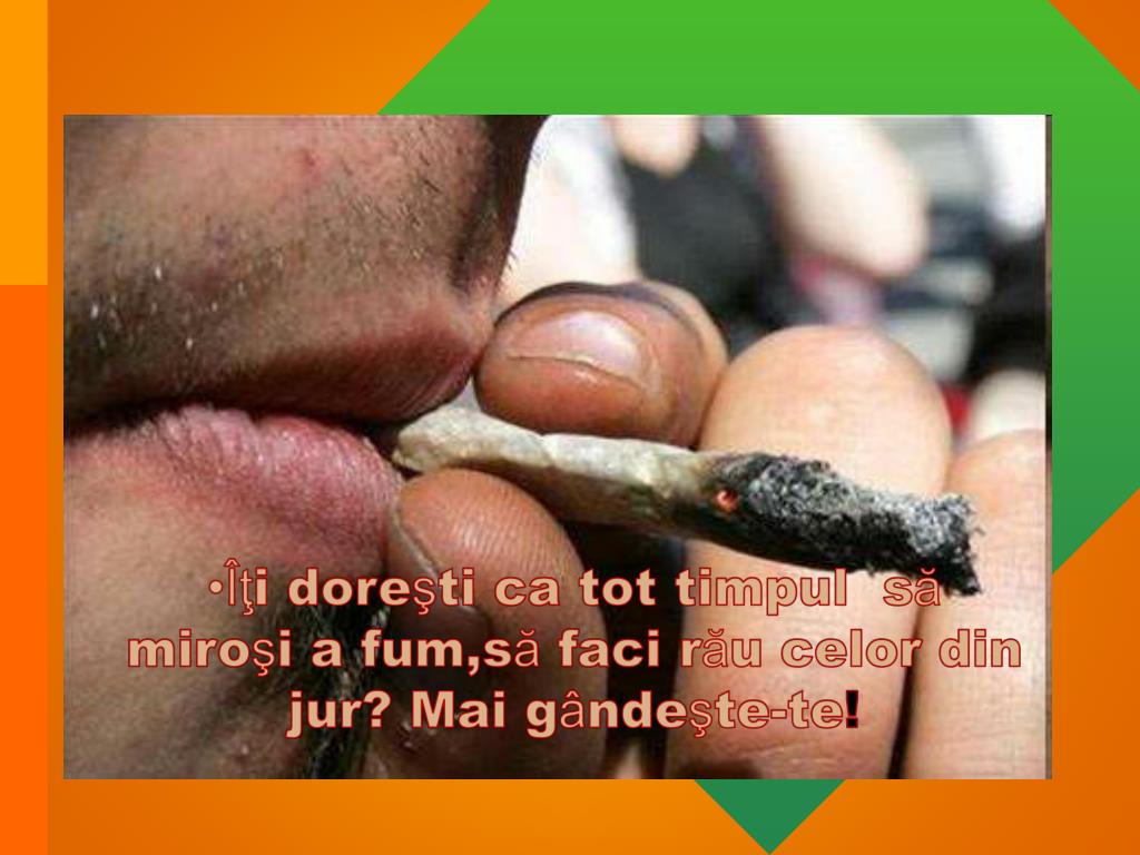 Tinerii şi tutunul • Mai mult de jumătate dintre fumători încep să fumeze înainte de 14 ani, iar 90% încep pâna la împlinirea vârstei de 19 ani. • Tutunul şi fumul de ţigară fac hainele şi părul să miroasă urât. Mirosul gurii este înrăutăţit şi făcut şi mai dezagreabil prin folosirea tutunului. • Intervenţia chirurgicală pentru cancerul gurii vă poate deforma pe viaţă înfăţişarea. • Tinerii sunt încurajaţi să fumeze prima ţigara de către reclamele şi promoţiile organizate de companiile producătoare de ţigări, de prietenii lor, de preţurile accesibile precum şi de posibilitatea de a le procura foarte uşor, unii comercianţi ignorînd reglementările în vigoare. Nicotina provoacă dependenţa, deşimulţitinerisubestimeazăacestlucru. Mai mult de 80% dintre tinerii care fumează un pachet sau mai mult pe zi recunosc nevoia sau dependenţa lor de ţigări. • 70 % dintre adolescenţi declară că dacă ar putea să aleagă încă o data ar alege să nu fumeze. • Mai mult de 400.000 de oameni mor anual din cauza bolilor provocate de fumat, adică mai mult decât cele provocate de alcool, crack, heroină, crime, sinucideri, accidente de maşină şi SIDA la un loc.