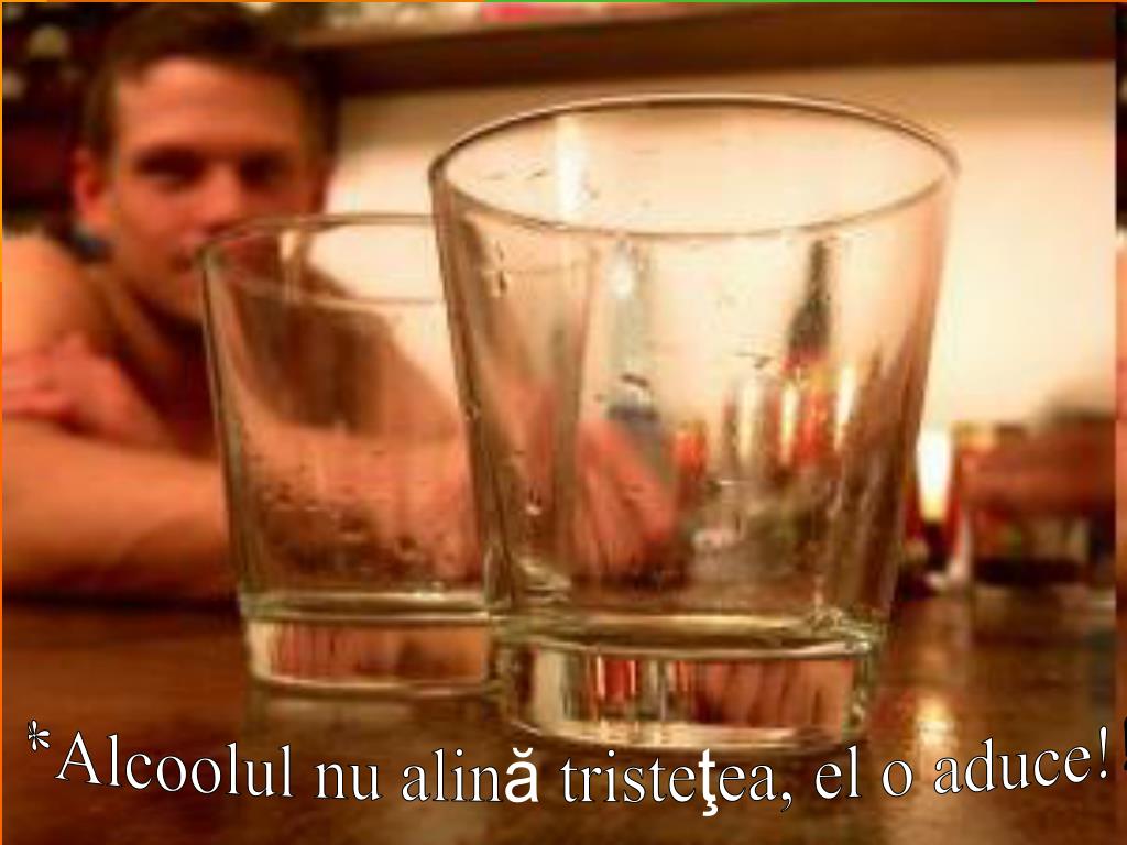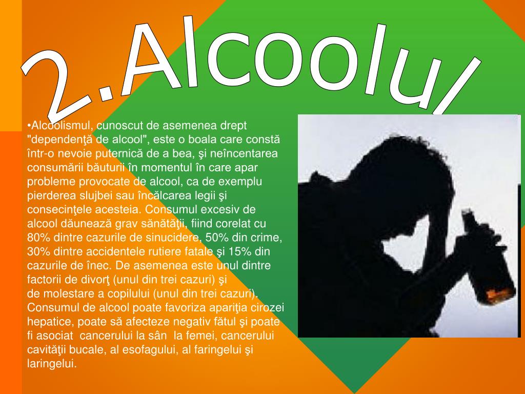 2.Alcoolul • Alcoolismul, cunoscut de asemenea drept "dependenţă de alcool", este o boala care constă într-o nevoie puternică de a bea, şi neîncentarea consumării băuturii în momentul în care apar probleme provocate de alcool, ca de exemplu pierderea slujbei sau încălcarea legii şi consecinţele acesteia. Consumulexcesiv de alcooldăuneazăgravsănătăţii, fiindcorelat cu 80% dintrecazurile de sinucidere, 50% din crime, 30% dintreaccidentelerutiere fatale şi 15% din cazurile de înec. De asemeneaesteunuldintrefactorii de divorţ (unul din treicazuri) şi de molestare a copilului (unul din treicazuri). Consumul de alcoolpoatefavorizaapariţiacirozeihepatice, poatesăafectezenegativfătulşipoatefiasociatcancerului la sân la femei, canceruluicavităţiibucale, al esofagului, al faringeluişilaringelui.