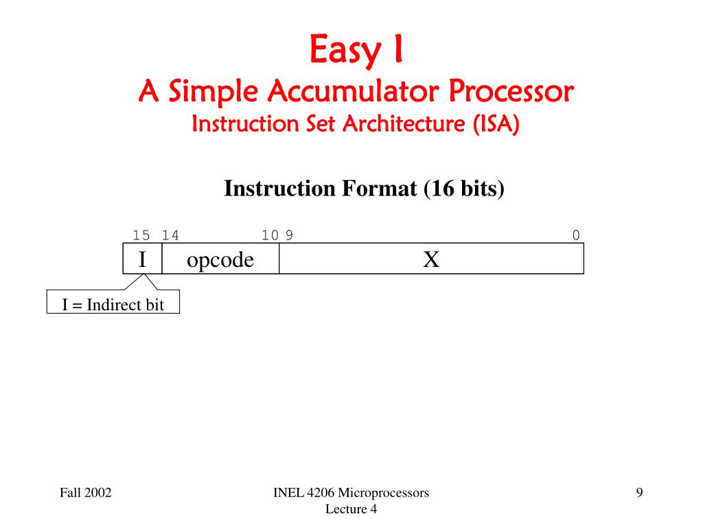 15 14 10 9 0 I opcode X Easy IA Simple Accumulator Processor Instruction Set Architecture (ISA) Instruction Format (16 bits) I = Indirect bit INEL 4206 Microprocessors Lecture 4