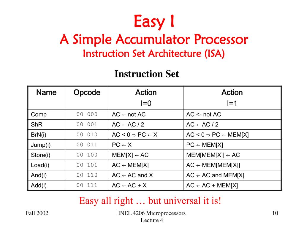Easy IA Simple Accumulator Processor Instruction Set Architecture (ISA) Instruction Set Easy all right … but universal it is! INEL 4206 Microprocessors Lecture 4