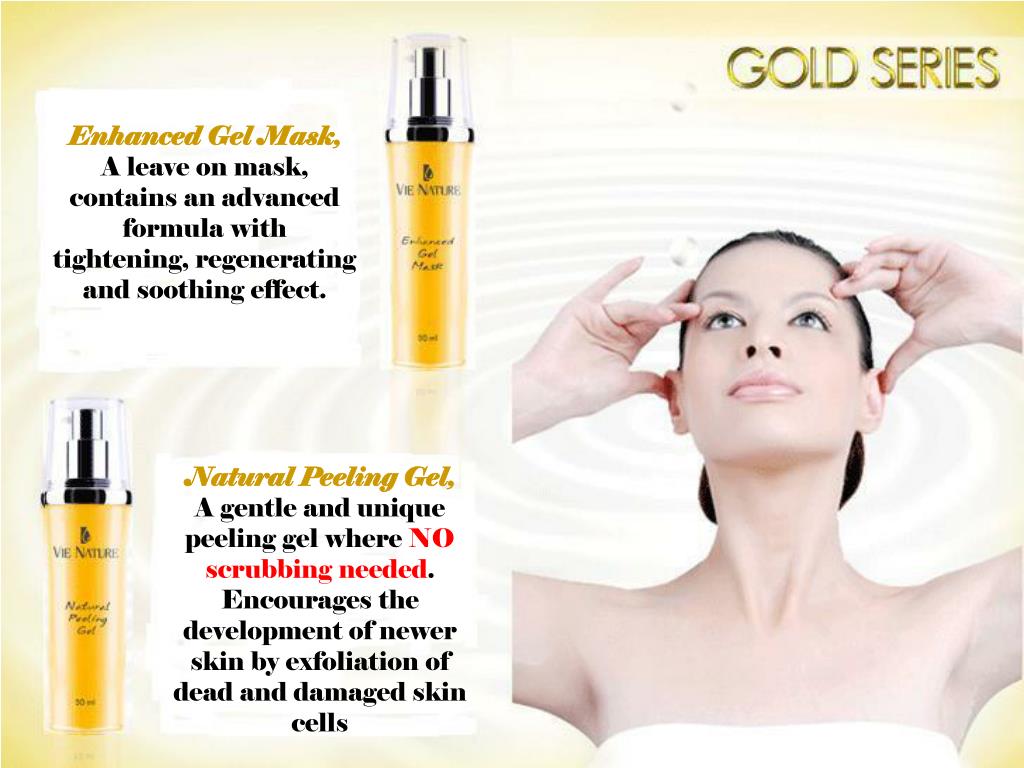 Enhanced Gel Mask, A leave on mask, contains an advanced formula with tightening, regenerating and soothing effect. Natural Peeling Gel, A gentle and unique peeling gel where NO scrubbing needed. Encourages the development of newer skin by exfoliation of dead and damaged skin cells