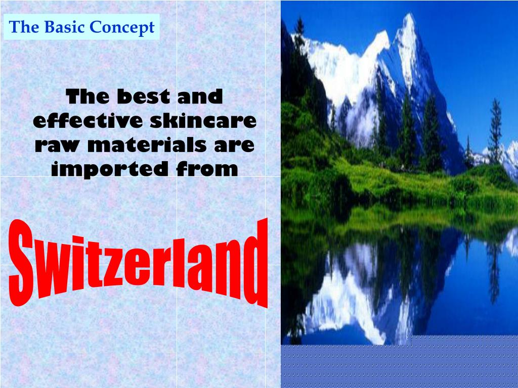 The Basic Concept Why Switzerland ? Switzerland is one of the most famous and experienced country in skincare Plant extracts from Switzerland are from the best source near the Alps, where the purest water is found