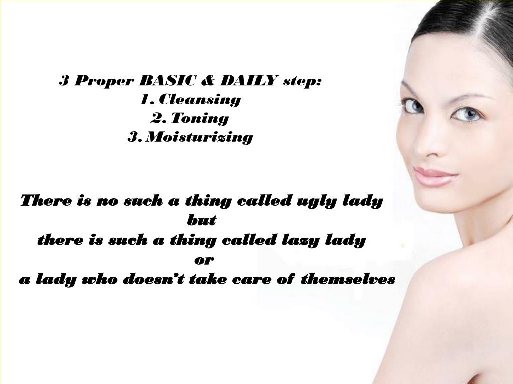 3 Proper BASIC & DAILY step: • Cleansing • Toning • Moisturizing There is no such a thing called ugly lady but there is such a thing called lazy lady or a lady who doesn’t take care of themselves