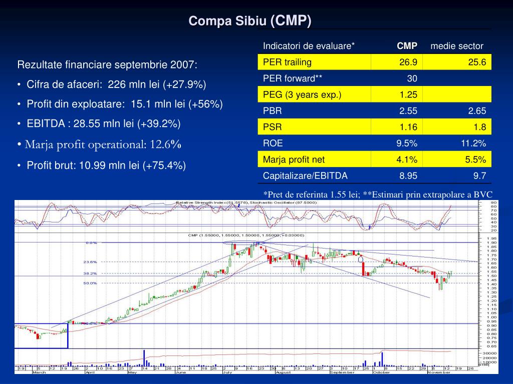 Compa Sibiu (CMP) • Rezultate financiare septembrie 2007: • Cifra de afaceri: 226 mln lei (+27.9%) • Profit din exploatare: 15.1 mln lei (+56%) • EBITDA : 28.55 mln lei (+39.2%) • Marja profit operational: 12.6% • Profit brut: 10.99 mln lei (+75.4%) *Pret de referinta 1.55 lei; **Estimari prin extrapolare a BVC