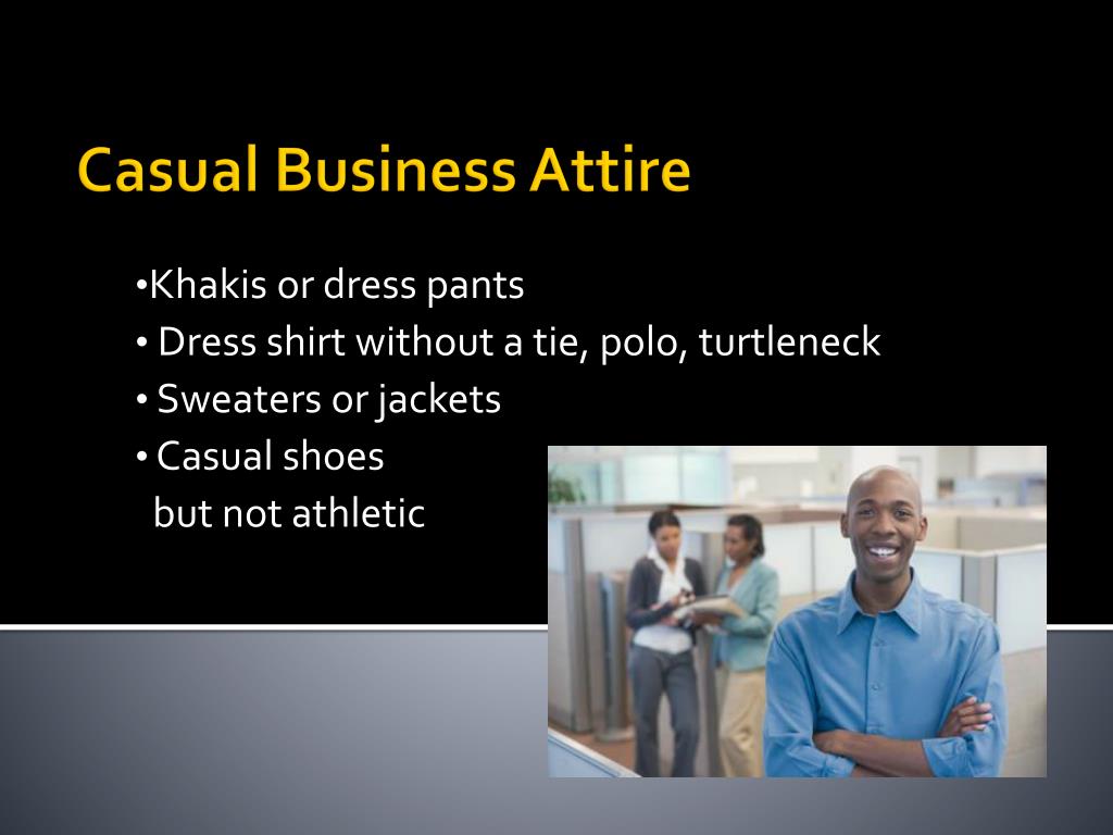 Khakis or dress pants Dress shirt without a tie, polo, turtleneck Sweaters or jackets Casual shoes but not athletic Casual Business Attire