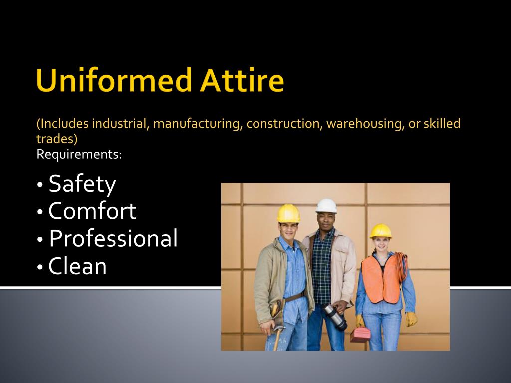 (Includes industrial, manufacturing, construction, warehousing, or skilled trades) Requirements: Safety Comfort Professional Clean Uniformed Attire