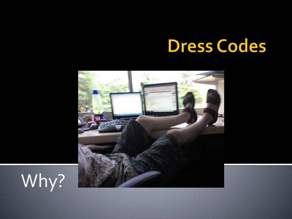 Companies require employees to dress in certain attire to: Project a professional image to customers, community, workplace, and potential employees Define what is appropriate for the job, setting, and safety Dress Codes