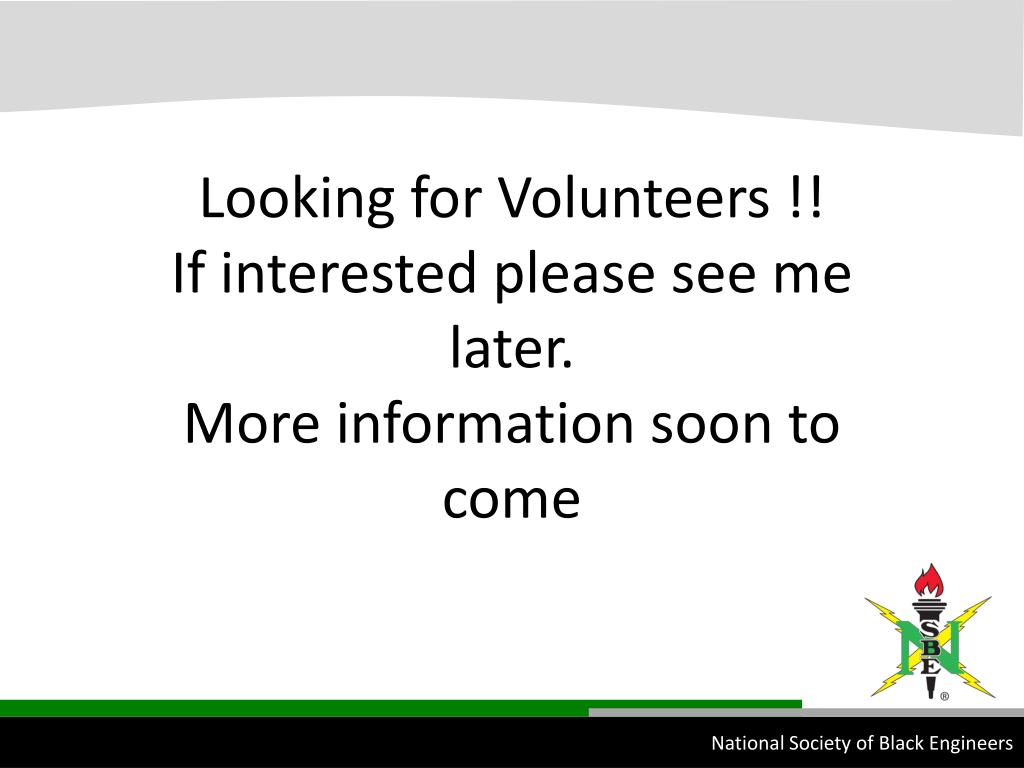 Looking for Volunteers !! If interested please see me later. More information soon to come National Society of Black Engineers